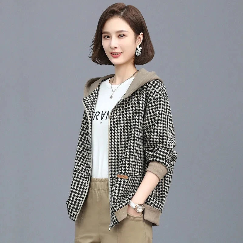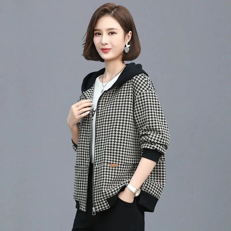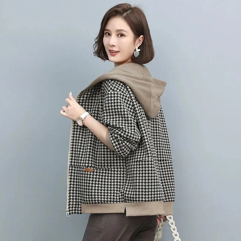 2024 Autumn Winter New Middle-aged and elderly Mothers Short Jacket Women's Patchwork Hooded Plaid Coat Casual Tops