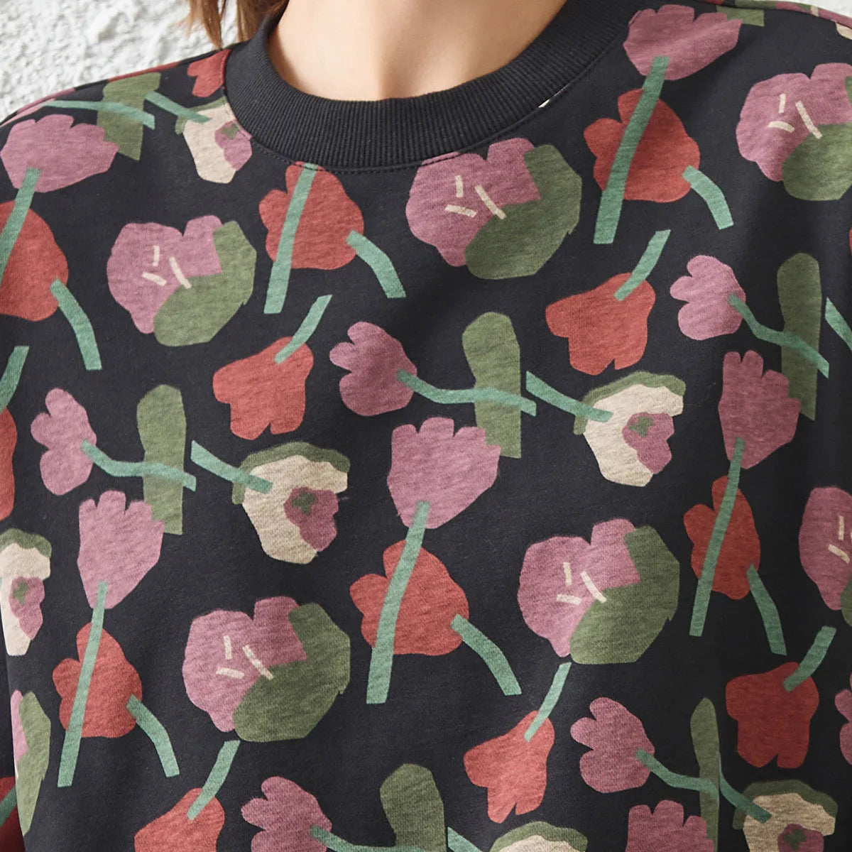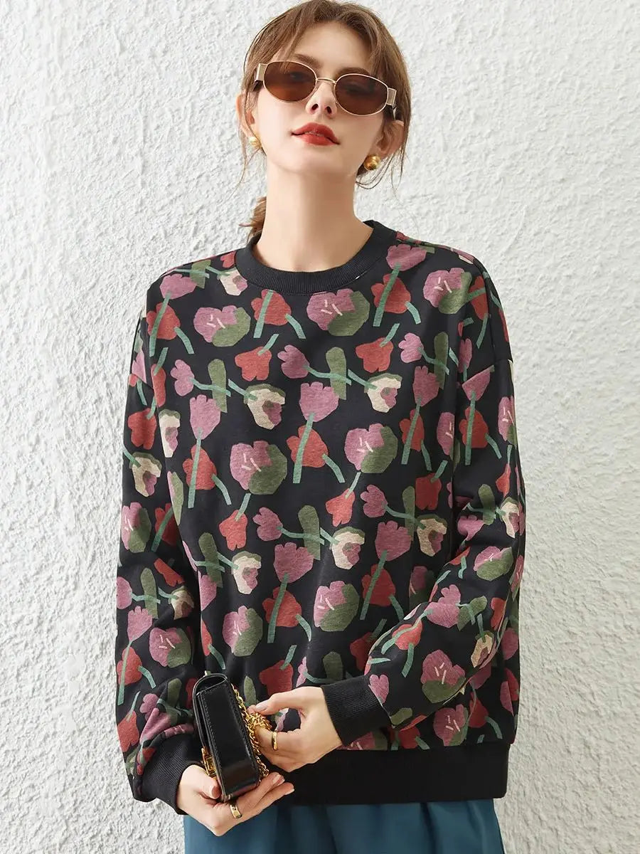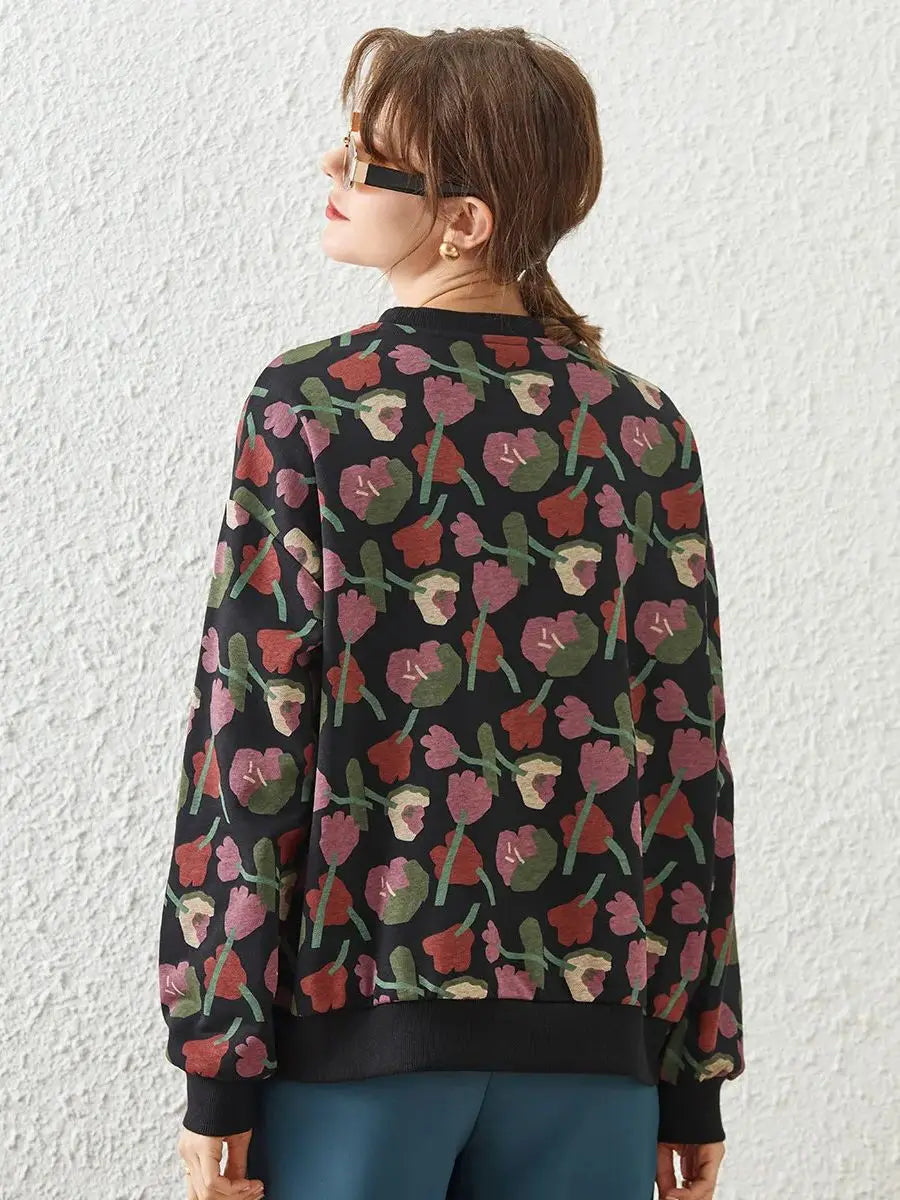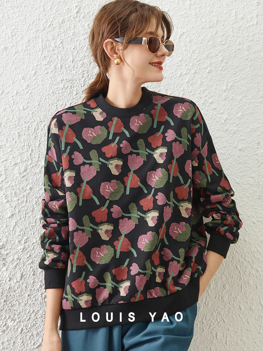 LOUIS YAO Women Sweatshirt 2024 Spring New Round Neck Long Sleeve Pullover Retro Print Flower Loose Fit Casual Tops