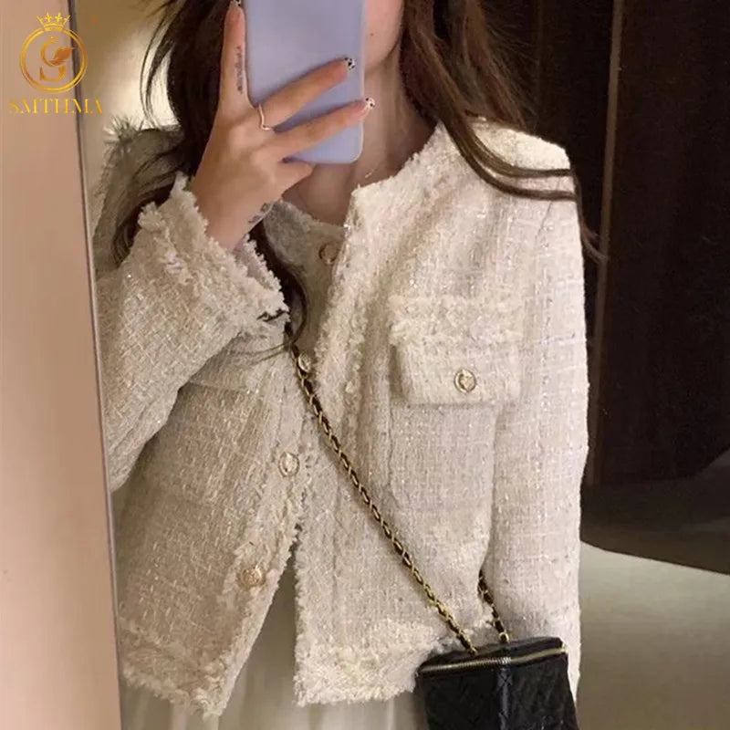 SMTHMA New Fashion Korean Chic Vintage Tweed Woolen Jacket Coat Women Autumn Single Breasted Plaid Tassel Office Lady Outwear